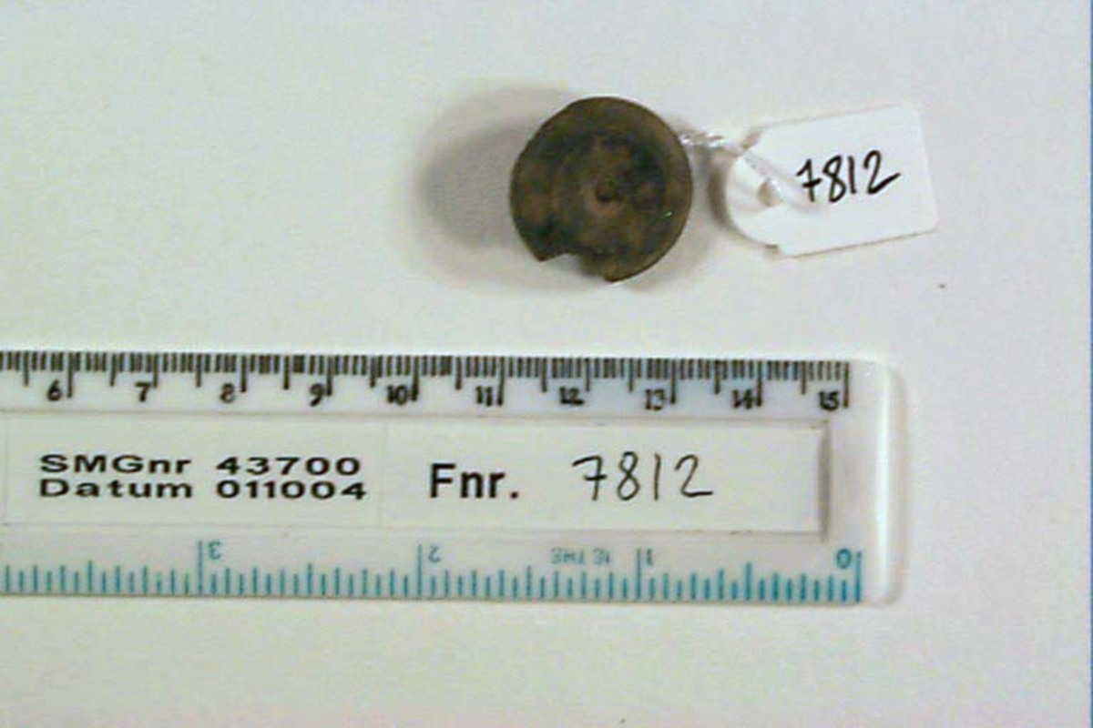 Undersydd knapp;svarvad med låg fot h: 3 mm, med genomgående hål för tråd/fästning, brätte svagt koniskt med kraterliknande grop med liten knopp i mitten. Dekorrand runt brättets kant. Flisa avbruten i brättet.