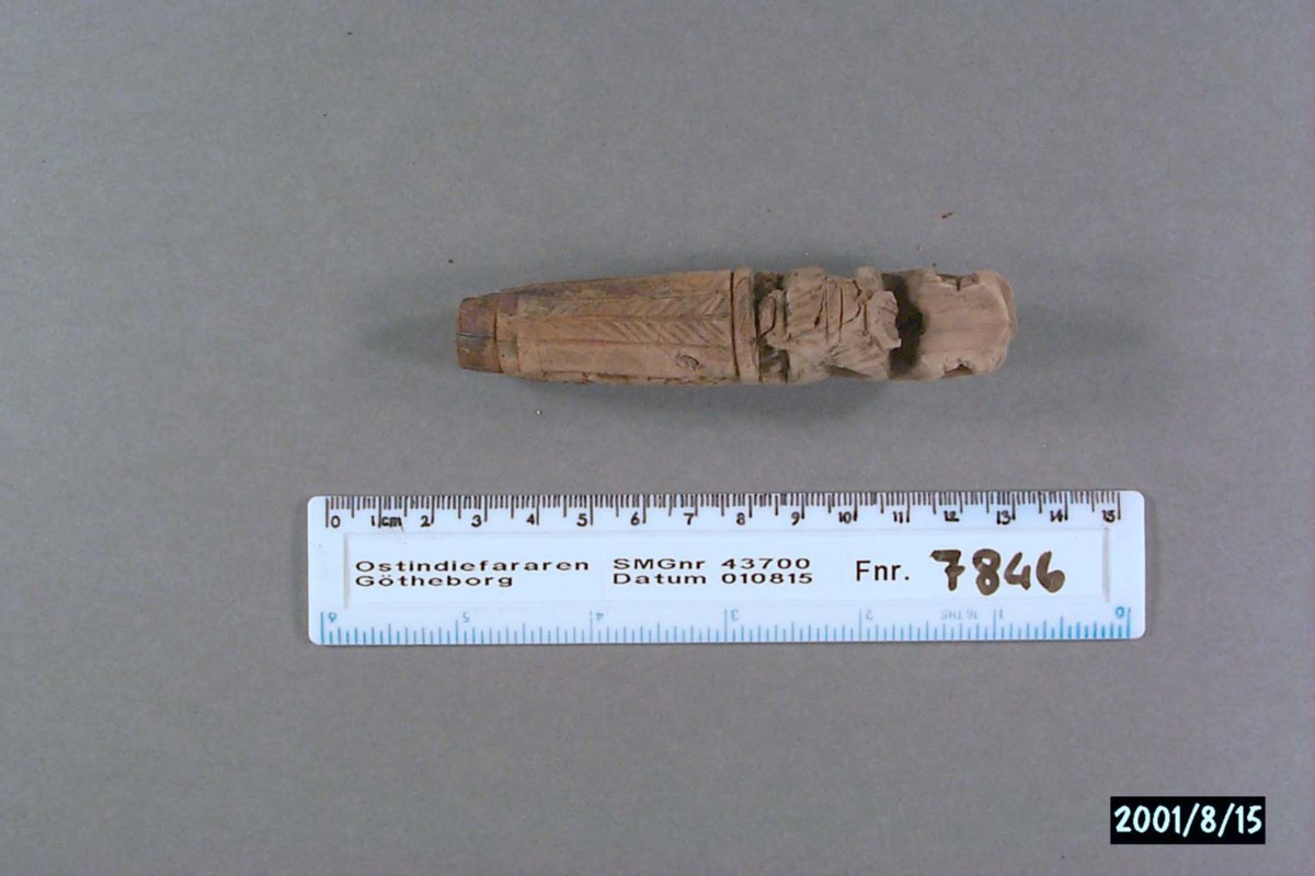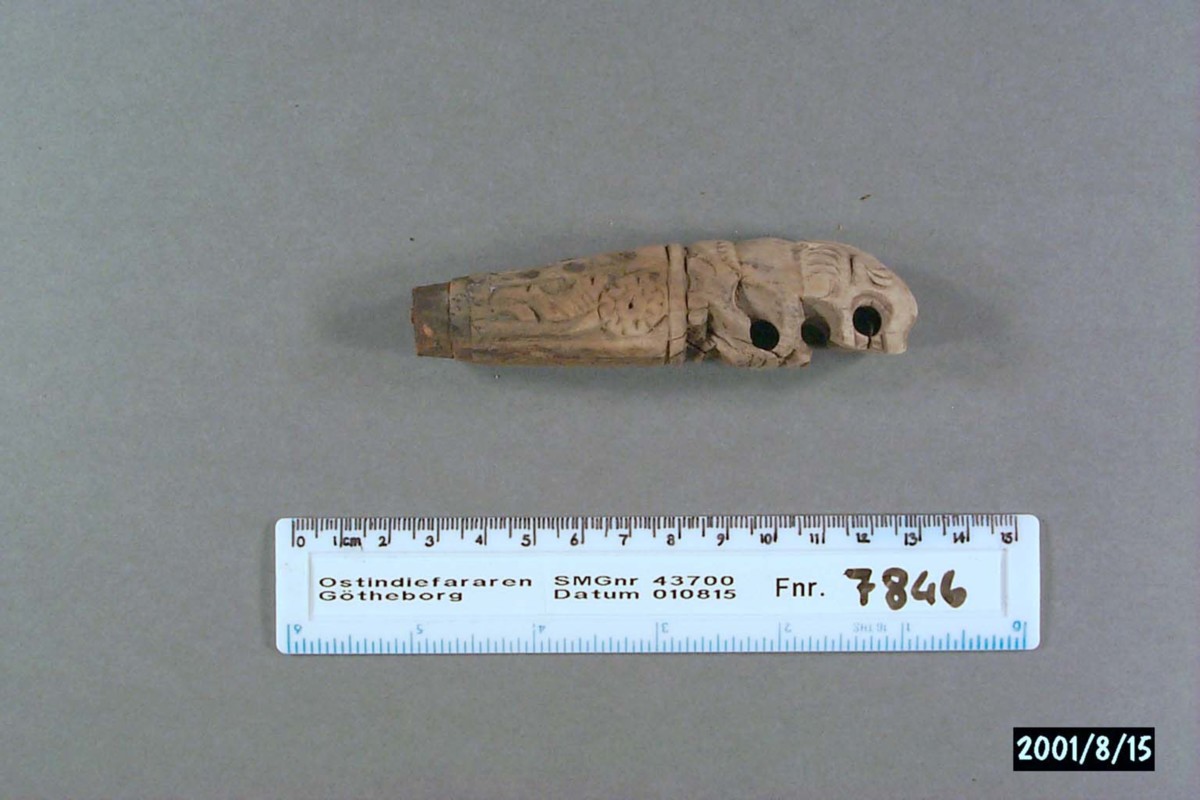 Föremålet är från vraket av ostindiefararen Götheborg, som gjorde tre resor till Kina 1739-45. Vid hemkomsten från den sista resan 12 september 1745 förliste fartyget vid grundet Hunnebådan strax utanför Nya Elfsborgs fästning. Vid flera tillfällen har material tagits upp från vraket. Föremålet kommer från de marinarkeologiska utgrävningarna på platsen 1986-1992.