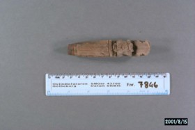 Snidat skaft till verktyg. Formen av ett sittande lejon på en pelare av blommor och sneda linjer. Hål i kortändan 7 mm. Rester av järn och korrosion.