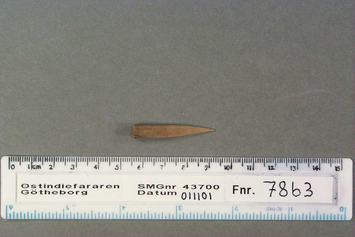 Föremålet är från vraket av ostindiefararen Götheborg, som gjorde tre resor till Kina 1739-45. Vid hemkomsten från den sista resan 12 september 1745 förliste fartyget vid grundet Hunnebådan strax utanför Nya Elfsborgs fästning. Vid flera tillfällen har material tagits upp från vraket. Föremålet kommer från de marinarkeologiska utgrävningarna på platsen 1986-1992.