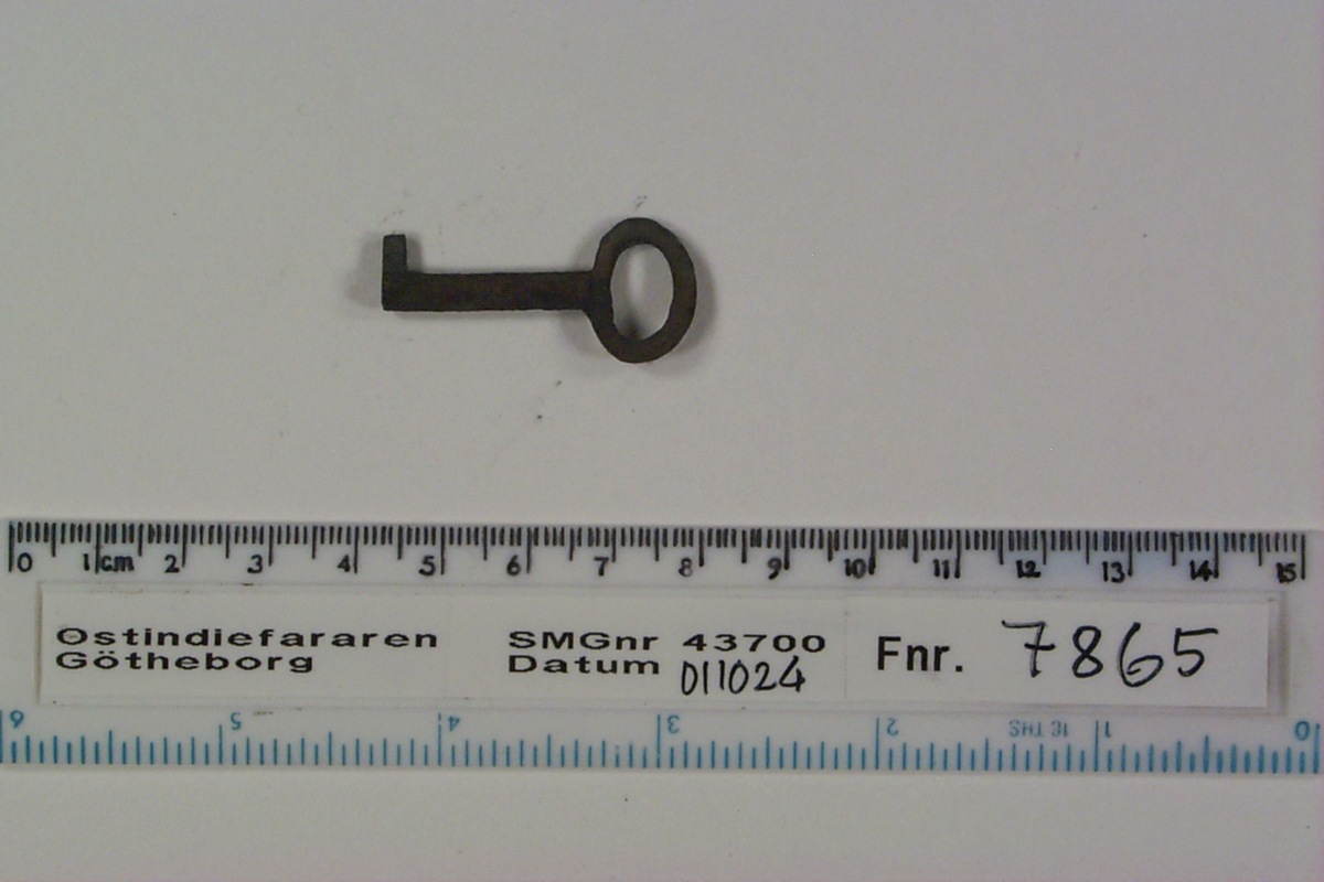 Vridlåsnyckel. Stammen är 24 mm lång och 5 mm i diameter. Greppet är ovalt och 17x12 mm. Axet består av en tapp och är 5x2 mm. Hålet i stammen har d: 2 mm och är 6,5 mm djupt.