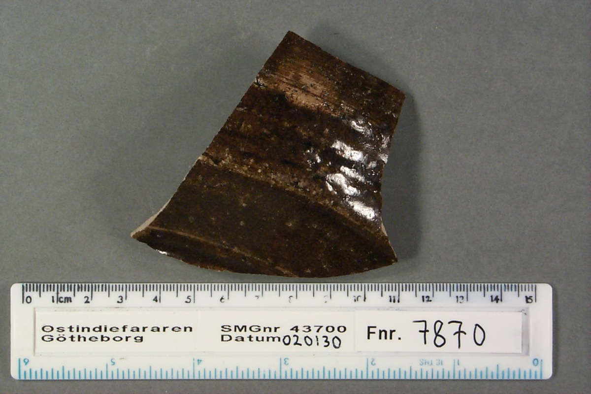 Föremålet är från vraket av ostindiefararen Götheborg, som gjorde tre resor till Kina 1739-45. Vid hemkomsten från den sista resan 12 september 1745 förliste fartyget vid grundet Hunnebådan strax utanför Nya Elfsborgs fästning. Vid flera tillfällen har material tagits upp från vraket. Föremålet kommer från de marinarkeologiska utgrävningarna på platsen 1986-1992.