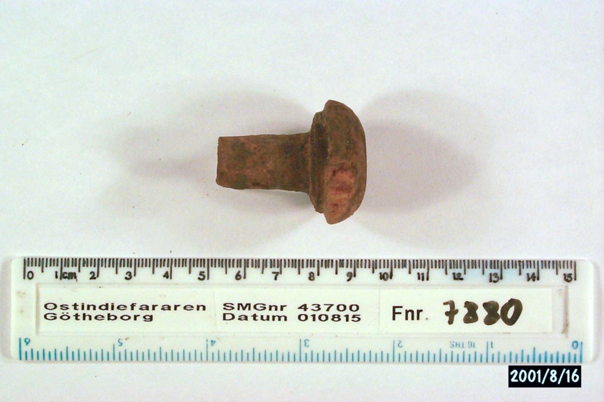 Svarvad, svampliknande konstruktion. Fotens längd 22 mm. Genomgående (?) hål i centrum d: i botten: 7 mm, i toppen: 14 mm. Kraftigt bemängd med järnkorrosion.