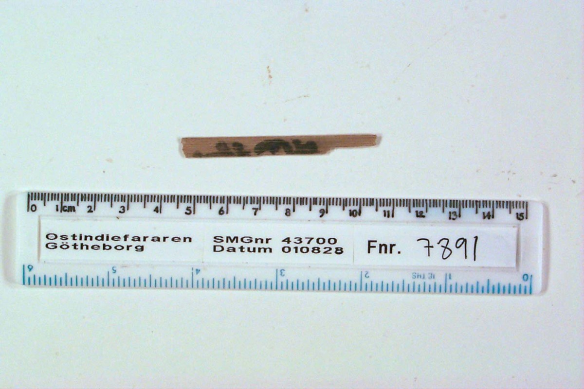 Föremålet är från vraket av ostindiefararen Götheborg, som gjorde tre resor till Kina 1739-45. Vid hemkomsten från den sista resan 12 september 1745 förliste fartyget vid grundet Hunnebådan strax utanför Nya Elfsborgs fästning. Vid flera tillfällen har material tagits upp från vraket. Föremålet kommer från de marinarkeologiska utgrävningarna på platsen 1986-1992.
