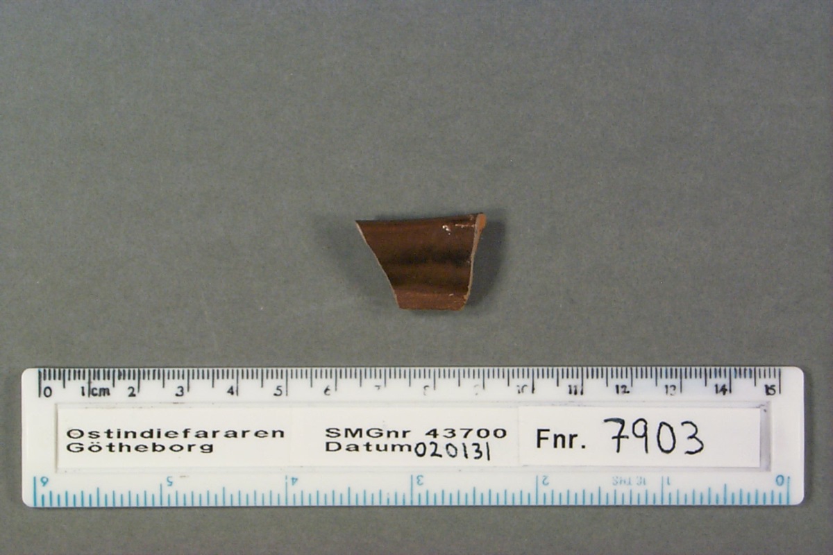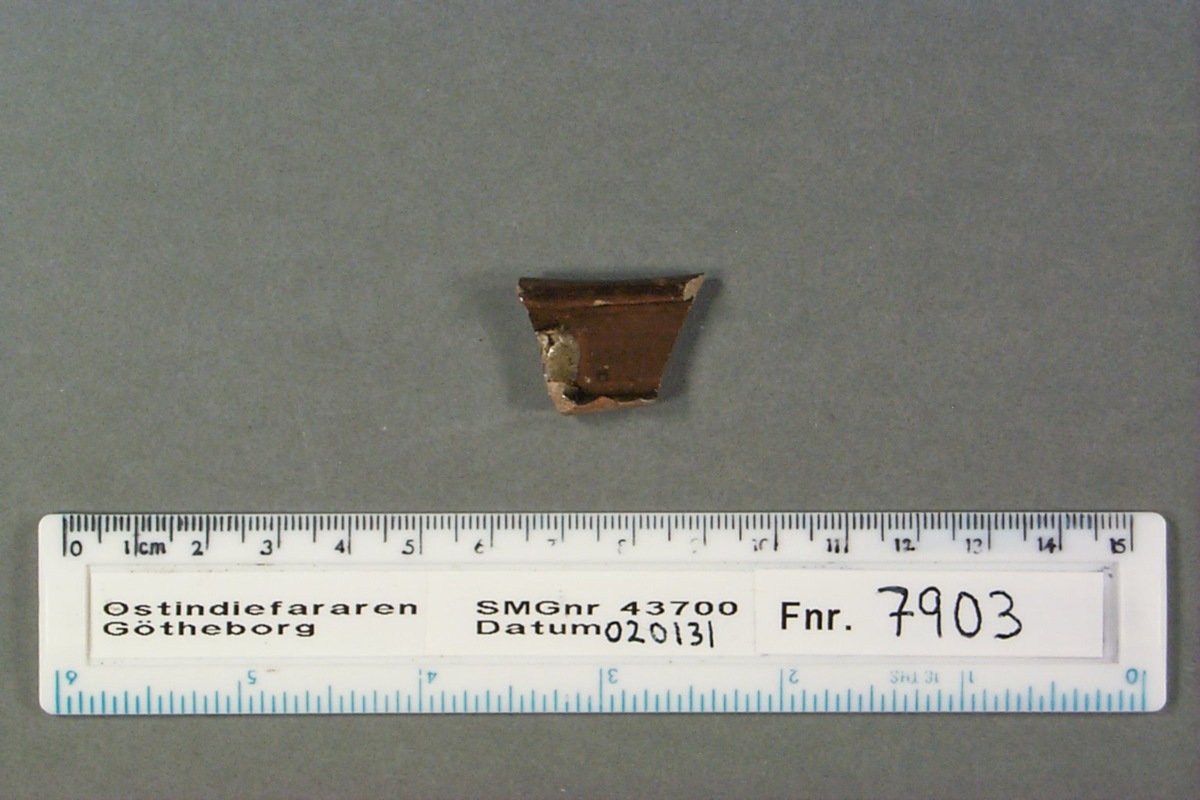 Föremålet är från vraket av ostindiefararen Götheborg, som gjorde tre resor till Kina 1739-45. Vid hemkomsten från den sista resan 12 september 1745 förliste fartyget vid grundet Hunnebådan strax utanför Nya Elfsborgs fästning. Vid flera tillfällen har material tagits upp från vraket. Föremålet kommer från de marinarkeologiska utgrävningarna på platsen 1986-1992.