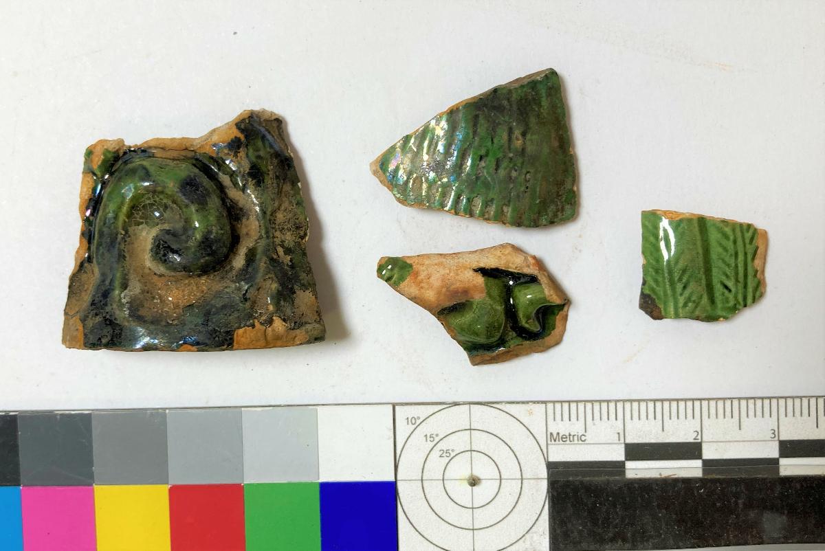 Fyra skärvor, två av papegoja, två av undulat. Grön glasyr på samtliga utsidor.