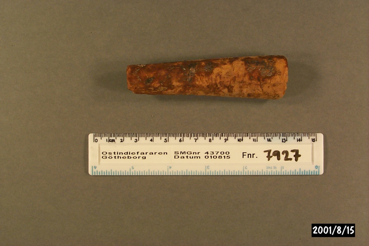 Föremålet är från vraket av ostindiefararen Götheborg, som gjorde tre resor till Kina 1739-45. Vid hemkomsten från den sista resan 12 september 1745 förliste fartyget vid grundet Hunnebådan strax utanför Nya Elfsborgs fästning. Vid flera tillfällen har material tagits upp från vraket. Föremålet kommer från de marinarkeologiska utgrävningarna på platsen 1986-1992.
