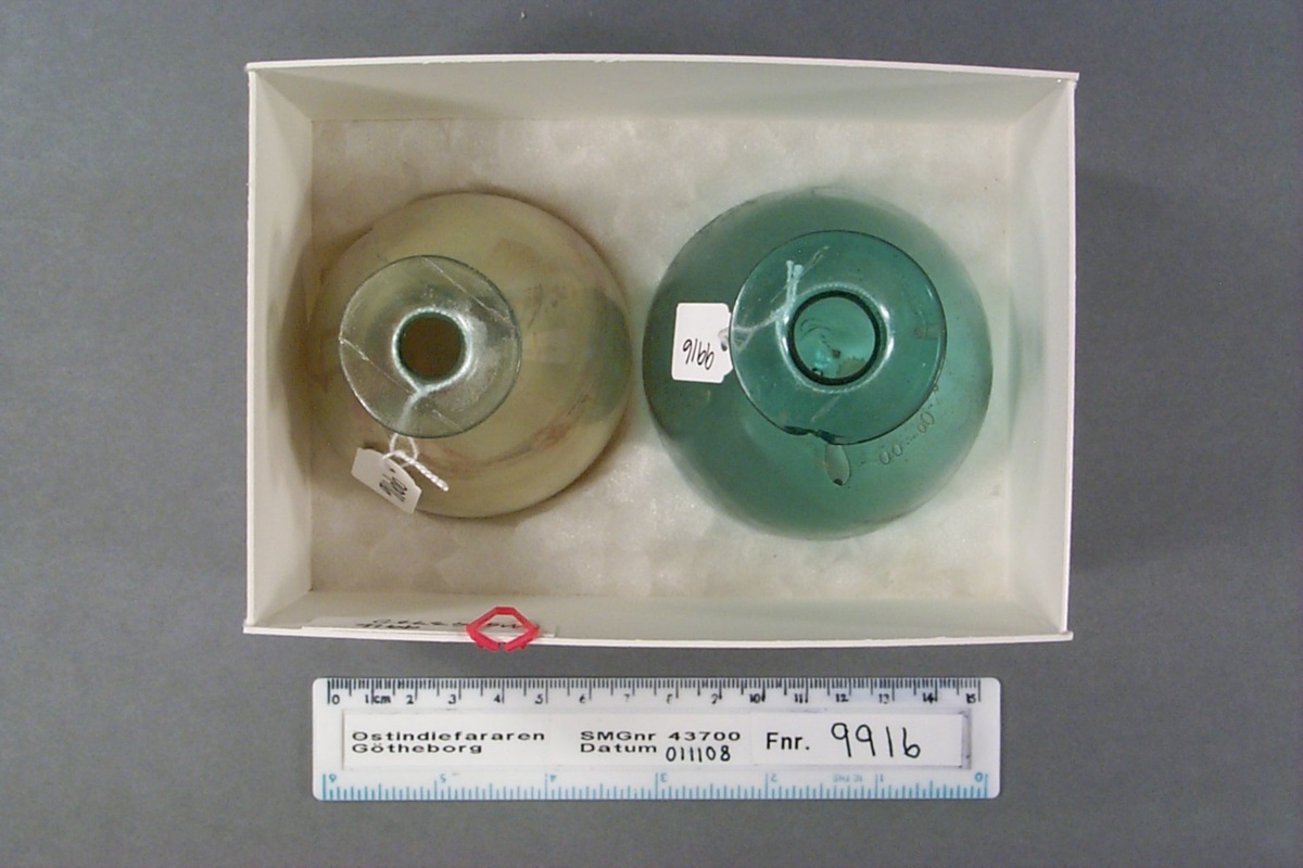 Två flaskliknande behållare, sannolikt tillhörande timglas. Den ena med mått ovan, intakt, grönaktig i färgen. Den andra gulaktig i färgen, ogenomskinlig, en skärva saknas, sprickor finns.