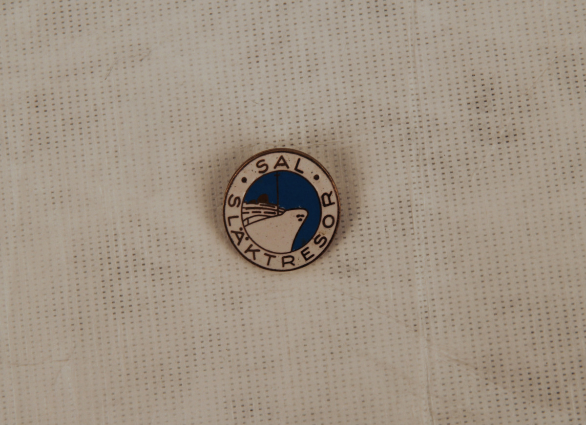 Rockslagsmärke från SAL. Fören på ett fartyg i vitt på ljusblå bottenfärg. Guldfärgad präglad text runt om som lyder SAL SLÄKTRESOR.