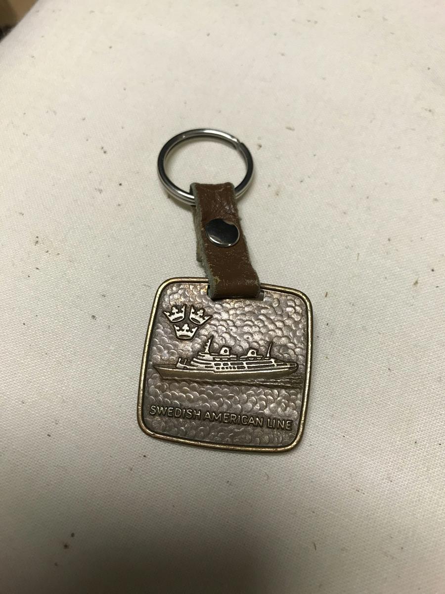Nyckelring från SAL i form av en metallplatta med brunt läderband och metallring. På metallplattan finns bilden av ett fartyg samt texten Swedish american line och SALs märke (tre kronor), allt i relief