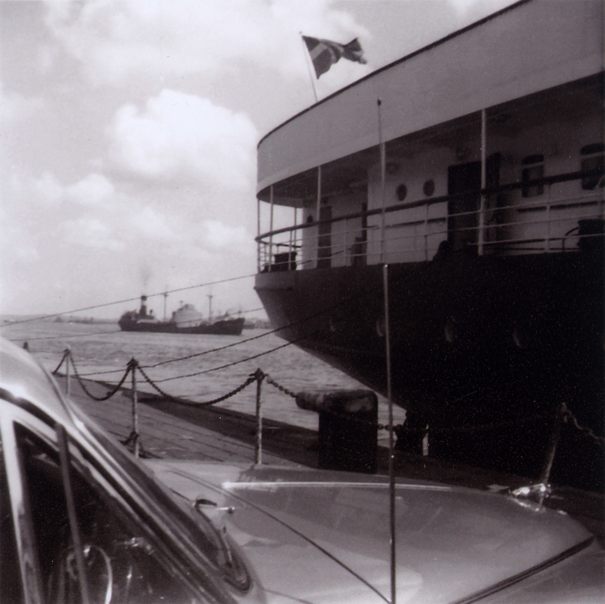 Föreställer SUECIAs akterparti i Tilbury, England, strax innan fartyget ska avsegla mot Göteborg.