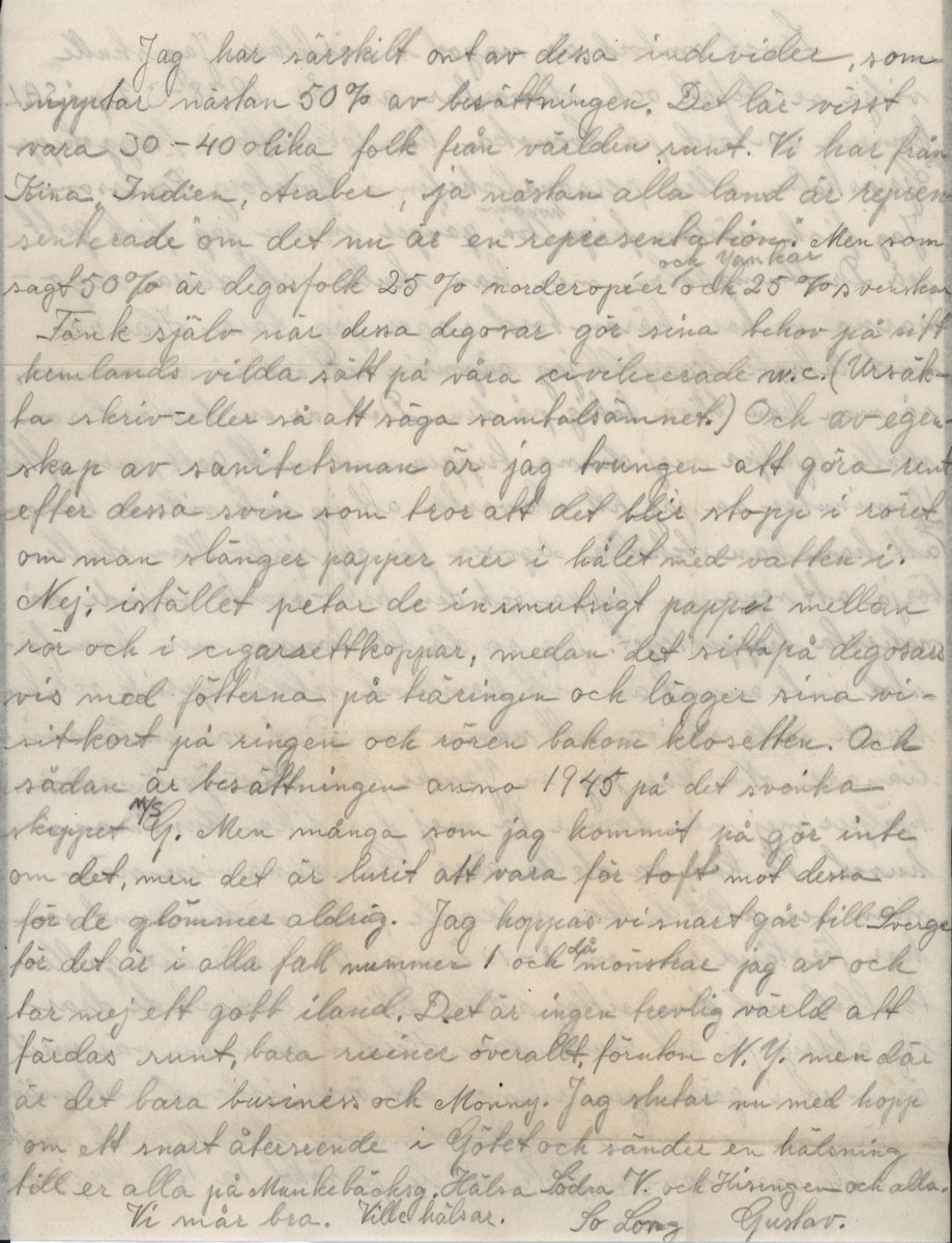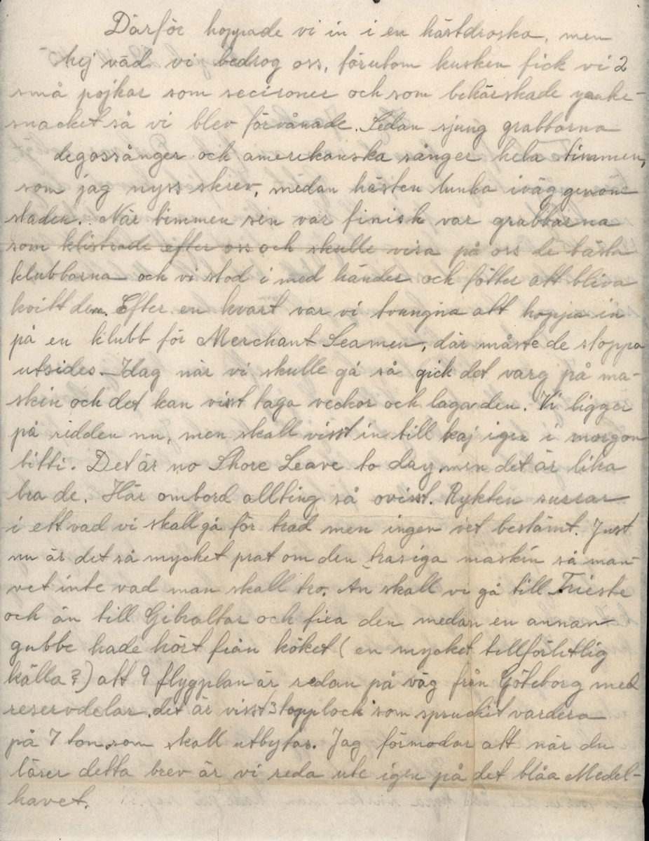 Handskrivet brev på två ark, med skrift på båda sidor. Författat 29 oktober 1945 av Gustaf Bjerkhede, sanitetsman på GRIPSHOLM, till en vän vid namn Jocke. Brevet skrevs ombord på fartyget, meden det låg ute på redden utanför Neapel, Italien.