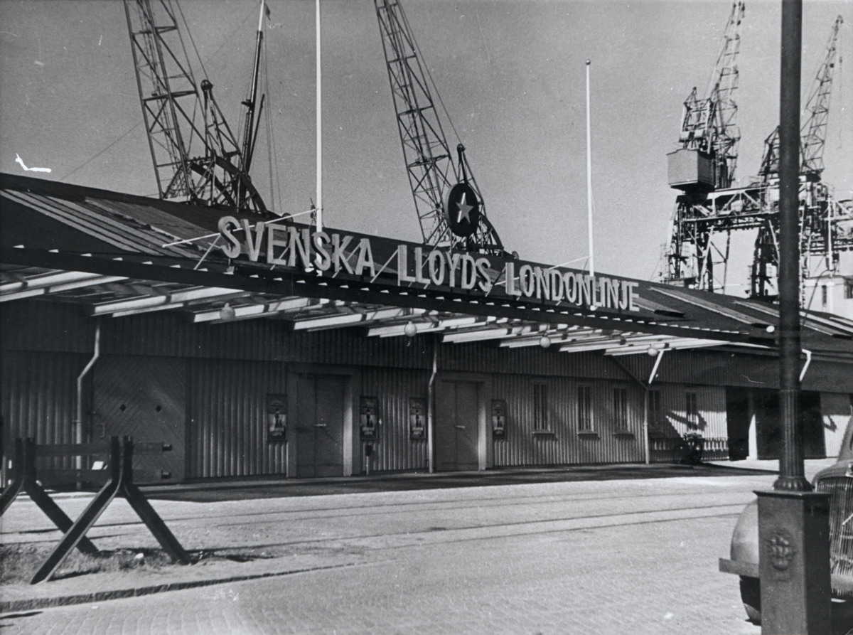 Föreställer Svenska Lloyds byggnad vid Amerikakajen, nedanför Stigbergstorget, i Göteborg. Härifrån avgick många av rederiets passagerarfartyg till England, fram till 1951 då de flyttade verksamheten till den nybyggda terminalen vid Majnabbe.