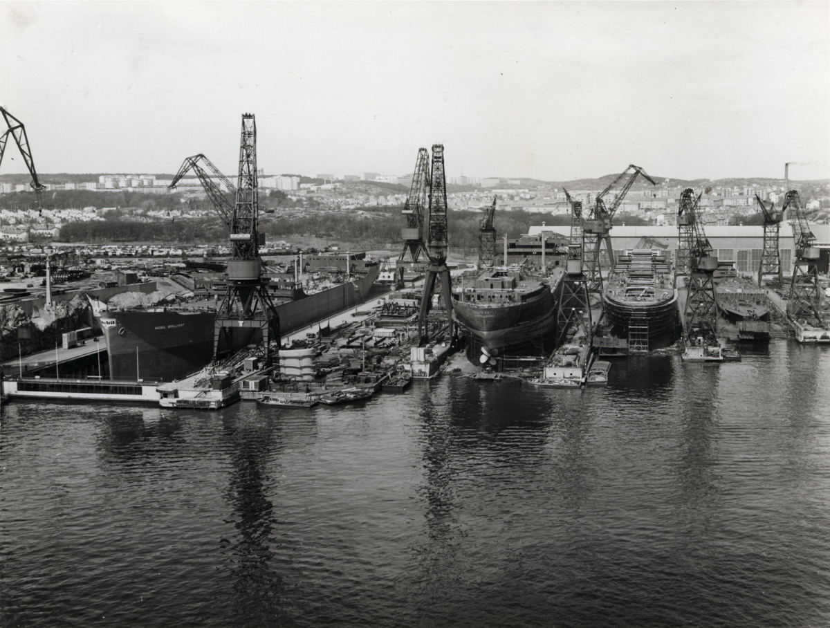 Svartvit vy från vattnet över Eriksbergs varvet. Tre fartyg ligger i dockor.