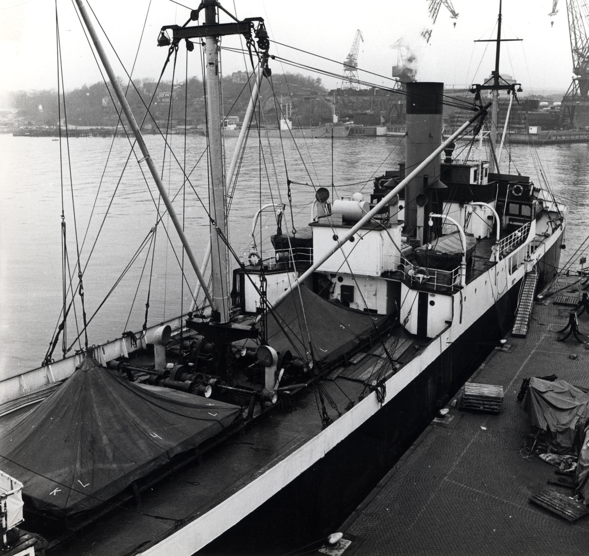 Svartvit bild kan ha varit publicerad i SST:s Kring kajutan. Fotograferad 1971-03-19. Föreställer MONARDA i Göteborgs hamn.