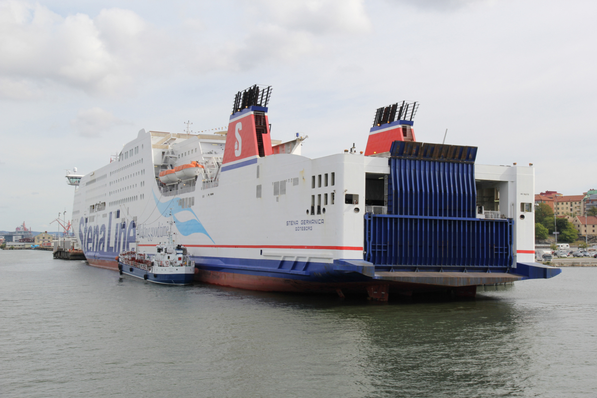 STENA GERMANICA III i Göteborgs hamn. Fotograferad från M/S TRUBADUREN under turen den 2013-08-27 som Göteborgs hamn och Sjöfartsmuseet anordnade för att åka ut till Skandiahamnen och titta på världens största containerfartyg i Triple-E klassen, Maersk Mc-Kinney Møller då hon anlöpte Göteborg för första gången på sin jungfrufärd.