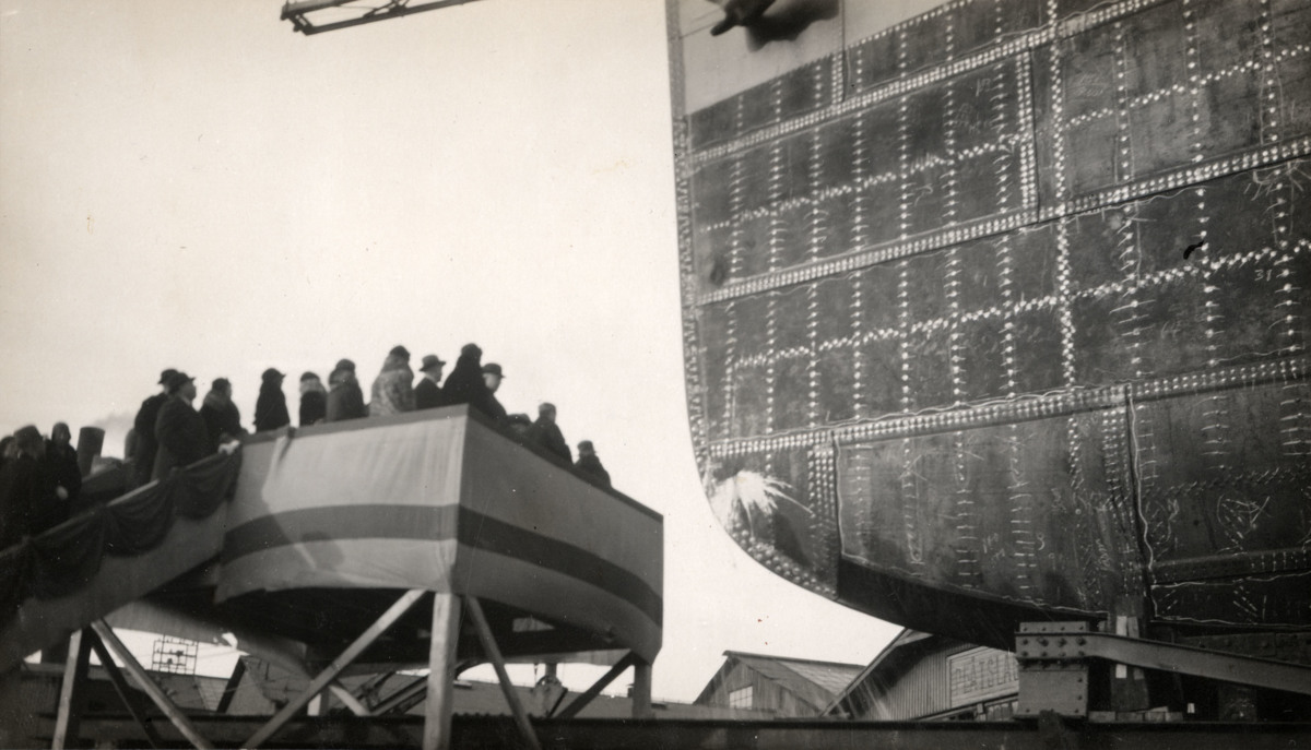 Fotografi föreställande motorlastfartyget LARVIKSFJORD. Fotografiet är taget tidigt 1930 vid fartygets dop på Götaverken, där hon byggts. Fartyget sjösattes, tillsammans med det identiska TØNSBERGFJORD, i mars 1930 och levererades till sin beställare, Norske Amerika Linje, i maj 1930.