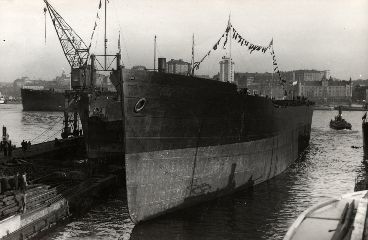 Fotografi föreställande motorlastfartyget TØNSBERGFJORD. Fotografiet är taget 1930 i samband med fartygets sjösättning på Götaverken, där hon byggts. Fartyget sjösattes, tillsammans med det identiska LARVIKSFJORD , i mars 1930 och levererades till sin beställare, Norske Amerika Linje, i maj 1930.