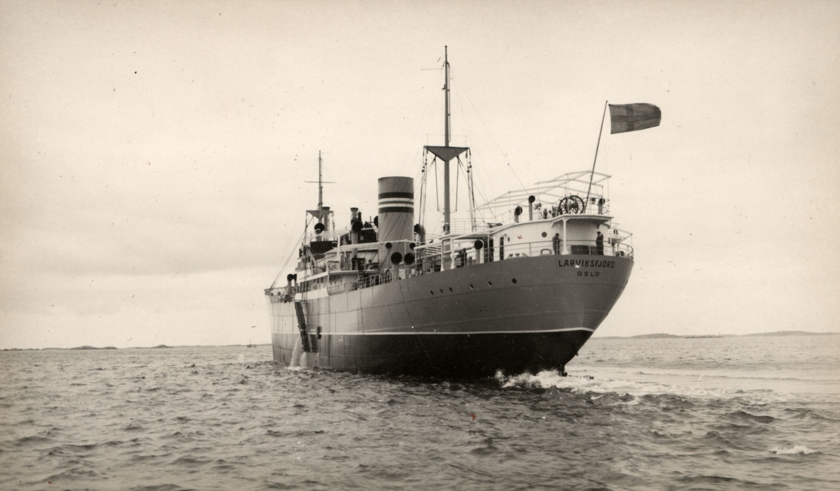 Fotografi föreställande motorlastfartyget LARVIKSFJORD till havs. Fotografiet är taget under början av 1930, mellan mars då fartyget sjösattes och maj då fartyget levererades, tillsammans med det identiska TØNSBERGFJORD, från Götaverken till sin beställare Norske Amerika Linje.