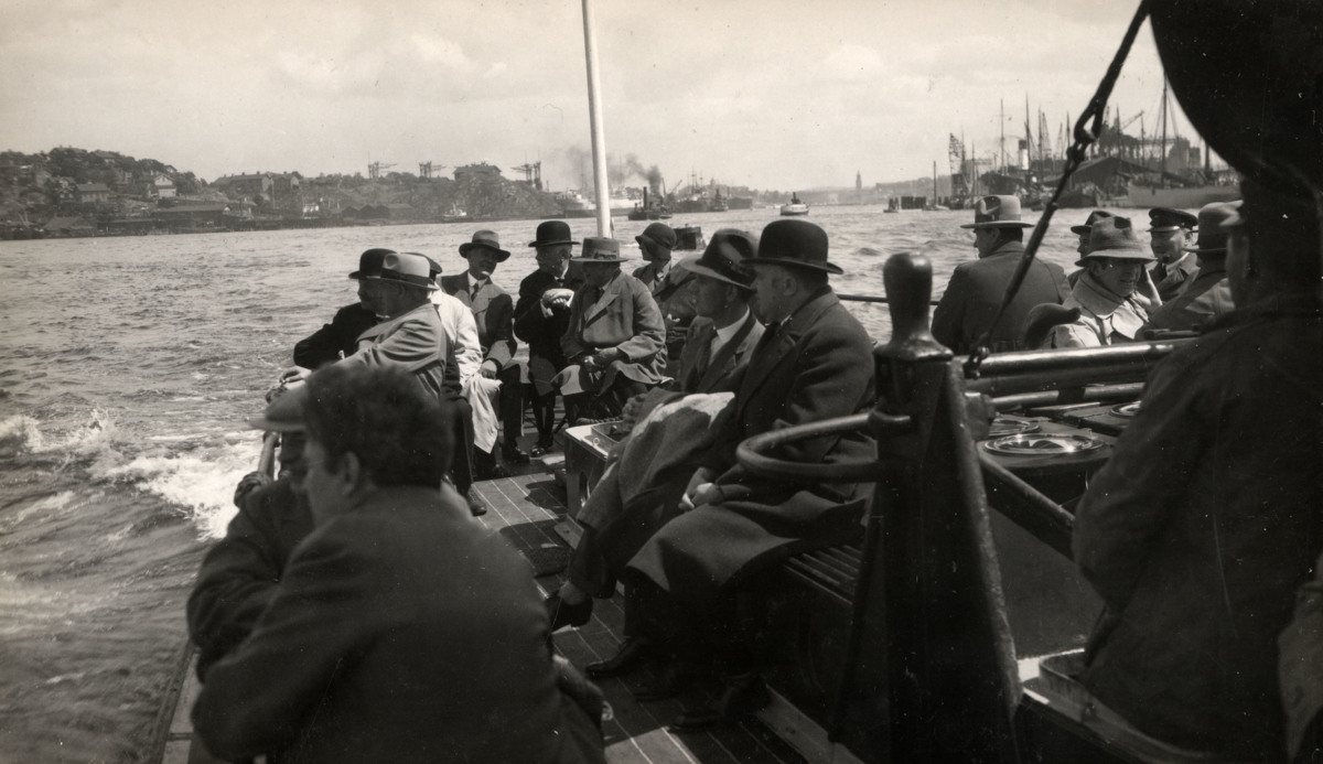 Fotografi föreställande en grupp människor på väg i en liten båt till motorlastfartyget LARVIKSFJORD eller TØNSBERGFJORD. Personerna på bilden är medlemmar av fartygens besiktningskommission samt andra intresserade, och de ska snart åka med på fartygets provtur. Fotografiet är taget under början av 1930, mellan mars då fartygen sjösattes och maj då fartygen levererades från Götaverken till sin beställare Norske Amerika Linje.