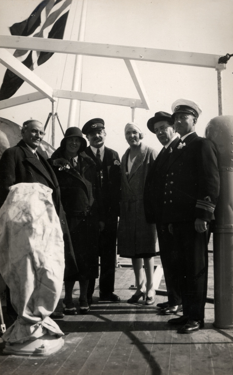 Fotografi föreställande en grupp människor stående på däck, på något av systerfartygen LARVIKSFJORD eller TØNSBERGFJORD. Personerna på bilden kommer från Götaverken, där fartygen byggdes, och från Norske Amerika Linje, som var beställare av fartygen. Längst till vänster syns Hugo Hammar. Fotografiet är taget omkring maj 1930, då fartygen levererades.