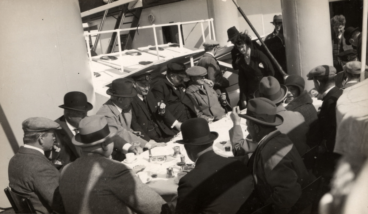 Fotografi föreställande en grupp människor på däck, på något av systerfartygen LARVIKSFJORD eller TØNSBERGFJORD, efter att provturen avklarats. Personerna på bilden kommer främst från besiktningskommissionen, Götaverken (där fartygen byggdes) och från Norske Amerika Linje (fartygens beställare). Fotografiet är taget omkring maj 1930, då fartygen levererades.