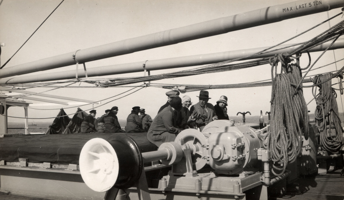 Fotografi föreställande en grupp människor vid den stora vinschen ombord på TØNSBERGFJORD, i samband med fartygets provtur. Personerna på bilden kommer främst från besiktningskommissionen, Götaverken (där fartyget byggdes) och från Norske Amerika Linje (fartygets beställare). Fotografiet är taget omkring maj 1930, då fartyget levererades, tillsammans med systerfartyget LARVIKSFJORD.