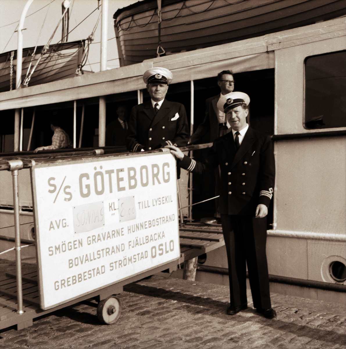 Två besättningsmän, kapten och överstyrman, poserar framför passagerarångfartyget GÖTEBORG i Göteborgs hamn. De står vid landgången, bredvid en skylt som informerar om att GÖTEBORG avgår till Oslo på söndag klockan 8.00, via Lysekil, Smögen, Gravarne, Hunnebostrand, Bovalllstrand, Fjällbacka, Grebbestad och Strömstad I bakgrunden skymtas också två ytterligare personer, troligtvis passagerare.