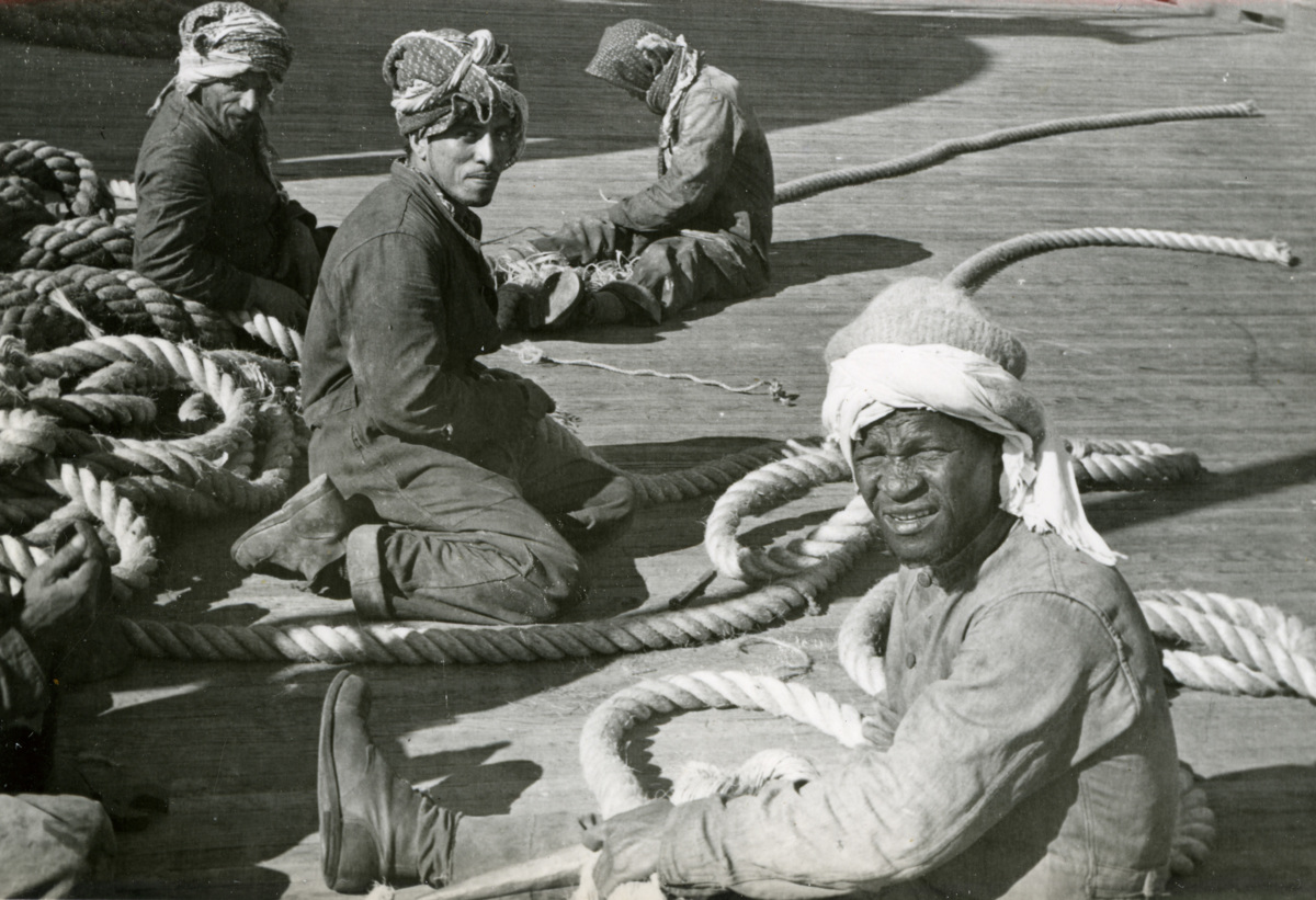 Föreställer trossmän i Suezkanalen. Fotografiet troligtvis taget under en resa med tankfartyget AVANCE 1956-1957. Resan gick från England till varv i Palermo, Sicilien och sen till Australien, Kina, Tokyo i Japan och sen tillbaka till Europa. Detta tog cirka ett år. Alla i besättningen mönstrade på i London.