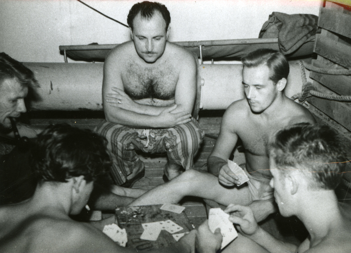 Föreställer några ur besättningen på AVANCE, cirka 1955-57. Fotografiet taget antingen under en resa till Venezuela 1955 eller till Australien, Kina och Japan 1956-1957.