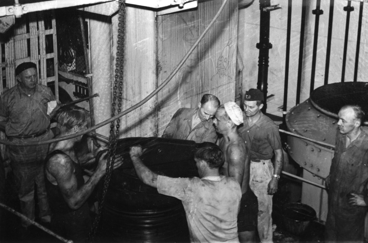 Föreställer kolvhållning i maskin på AVANCE, cirka 1955-57. Fotografiet taget antingen under en resa till Venezuela 1955 eller till Australien, Kina och Japan 1956-1957.