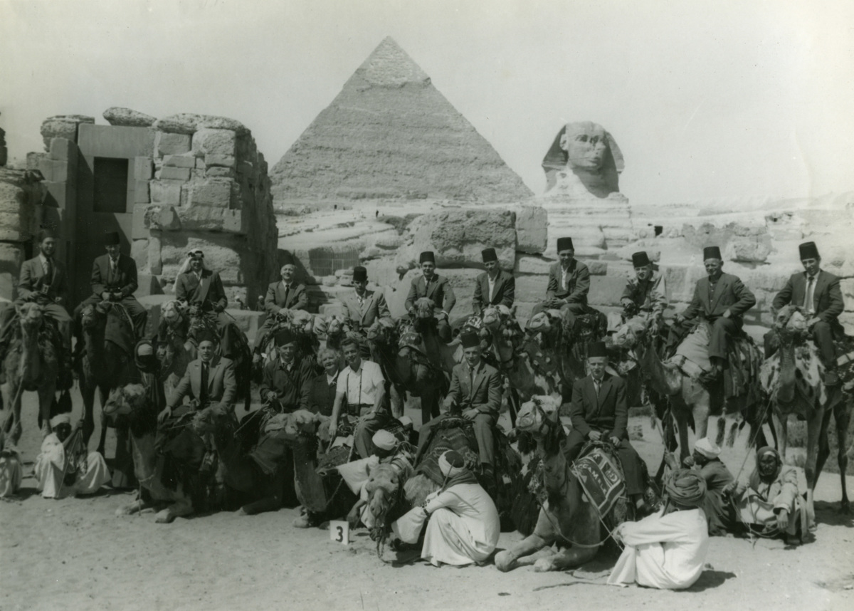 Besättningen på Rederi AB Transmarins ULLA poserar framför pyramiderna i Egypten. Fotografiet är taget på hösten 1955 eller under 1956. ULLA gick vid denna tid mellan England-Tyskland-Holland och Medelhavet.