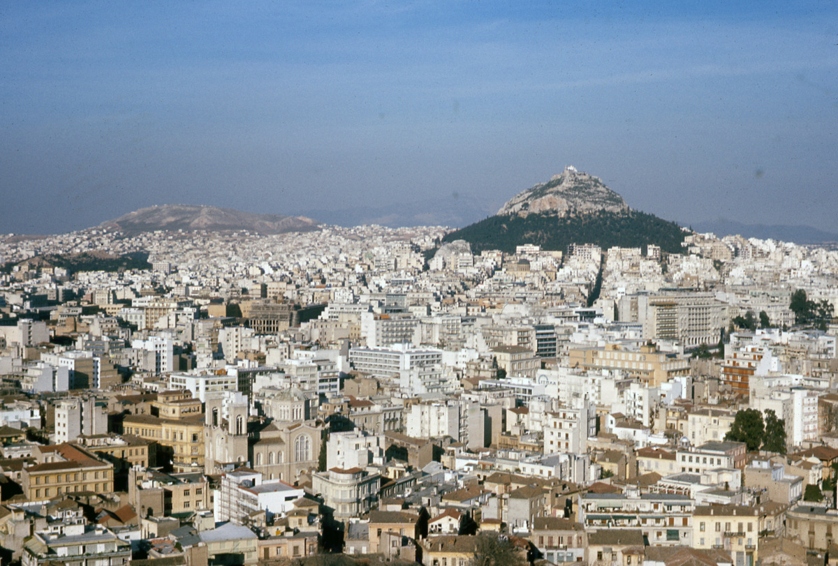 Vy över Aten i Grekland, från Akropolis. Fotografie taget under en resa med kylfartyget CRYSTAL SEA, som Nils Andersson arbetade på 1964-1968. Fartyget tillhörde Trelleborgs Ångfartyg men detta fotografi är taget när det var chartrat av Salénrederierna.