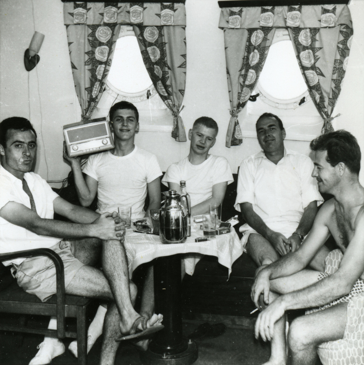 Delar av besättningen sittandes i Ulf Rosengrens hytt ombord motorlastfartyget JAPAN år 1964. Ulf Rosengren själv, som vid tiden var andre maskinist, sitter i mitten.