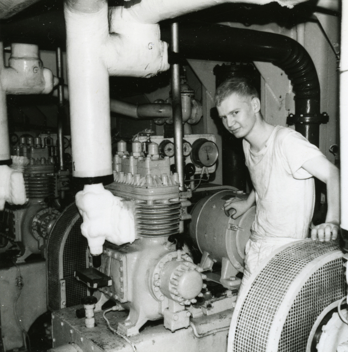 Ulf Rosengren står vid lastfrysen och kompressorer i maskinrummet ombord motorlastfartyget JAPAN år 1964. Ulf var vid tiden andre maskinist ombord.