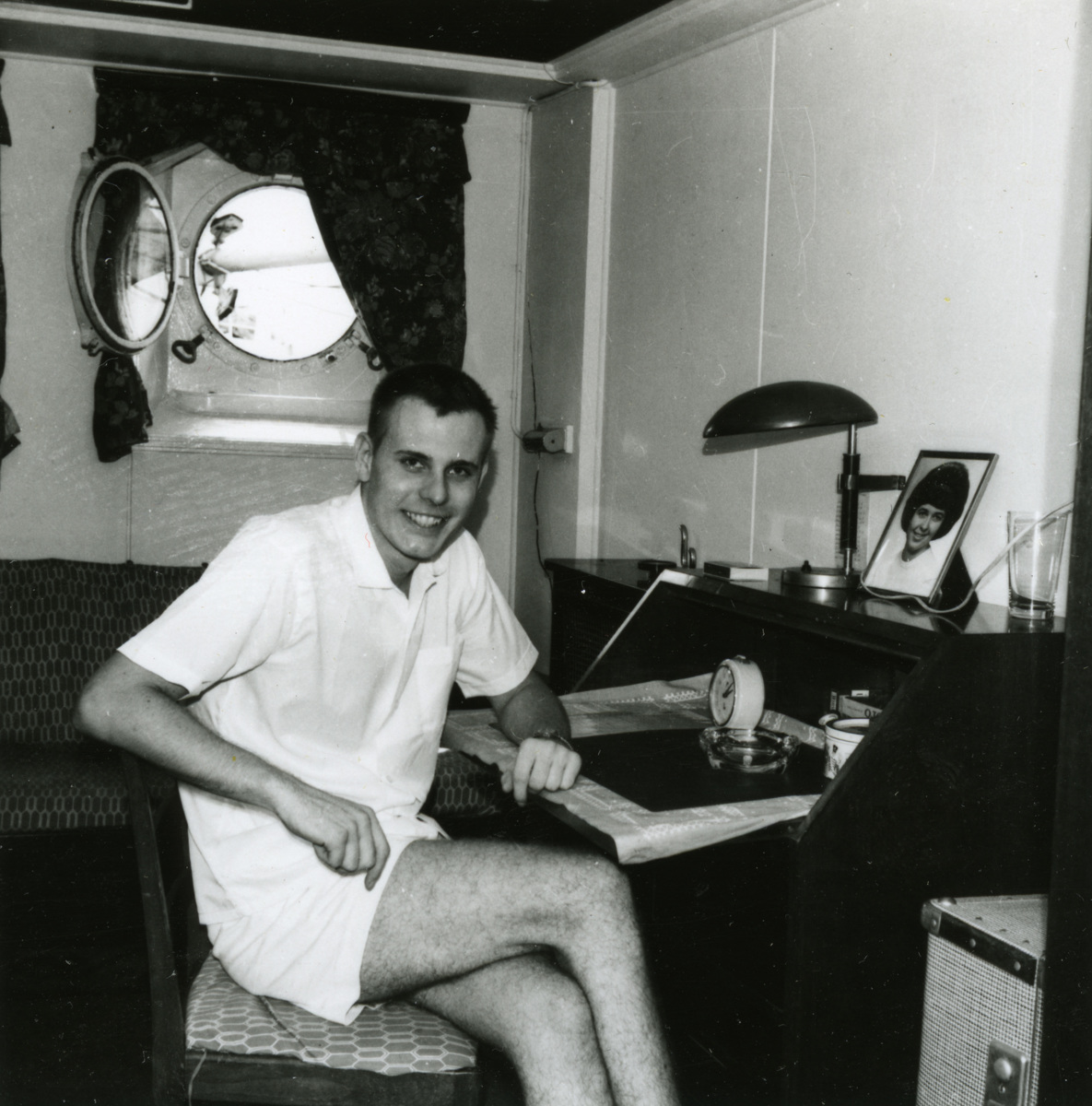 Fjärde maskinisten sittandes i sin hytt ombord motorlastfartyget JAPAN år 1964. Ulf Rosengren var vid tiden andre maskinist ombord.