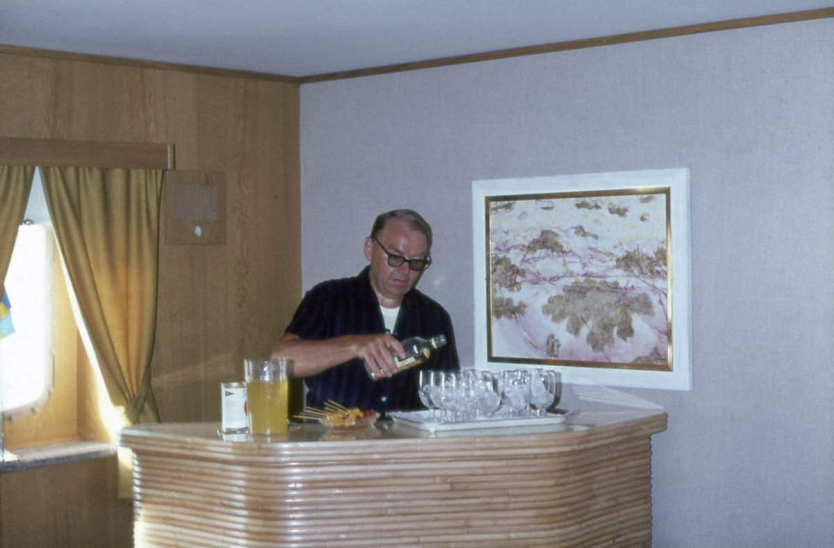En steward stående vid en bardisk ombord lastfartyget HAKONE år 1969. Ulf Rosengren arbetade under denna period som förste maskinist ombord.