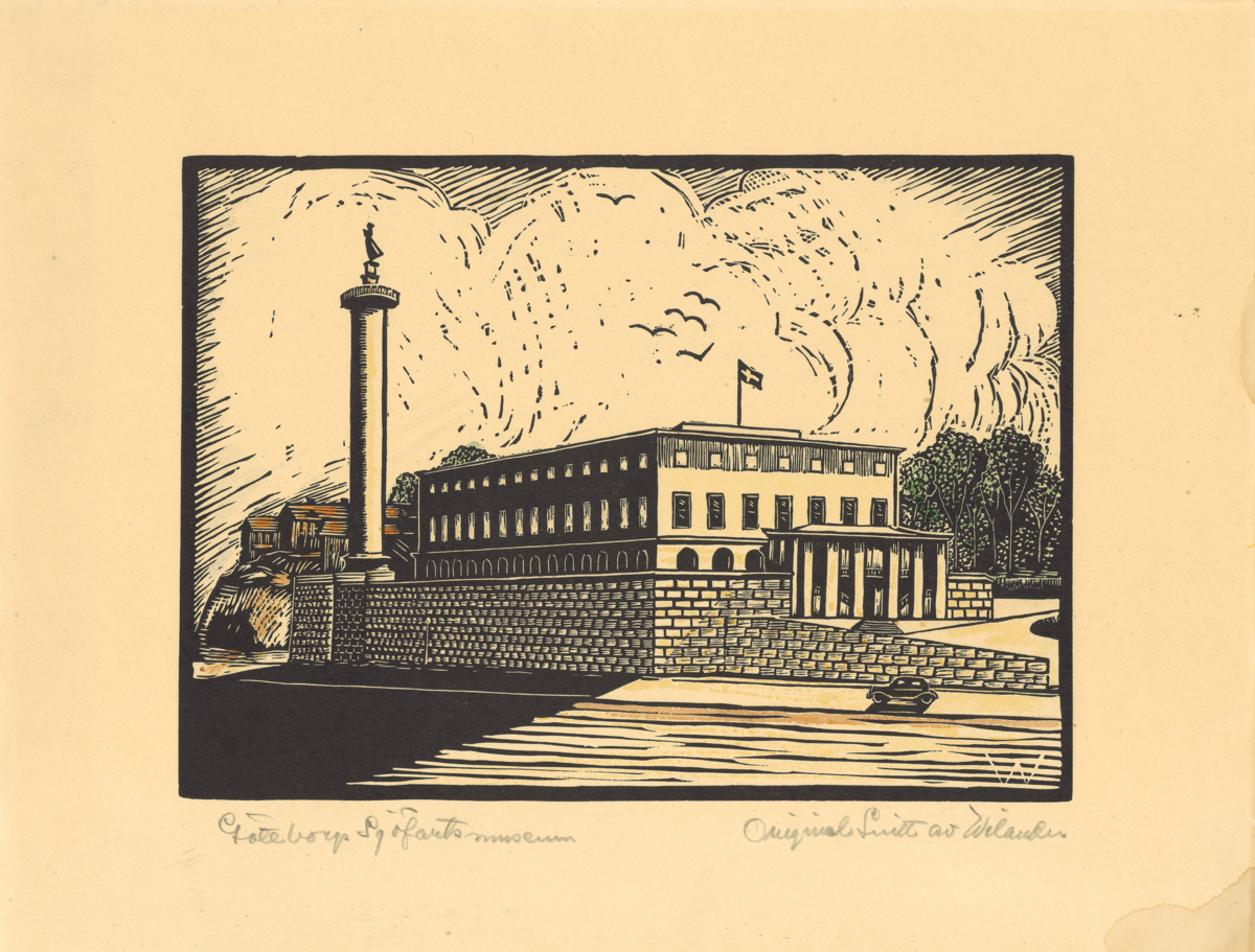 Färgtryck föreställande Göteborgs Sjöfartsmuseum samt Sjömanstornet och delar av närområdet. Originalsnitt av Wilander