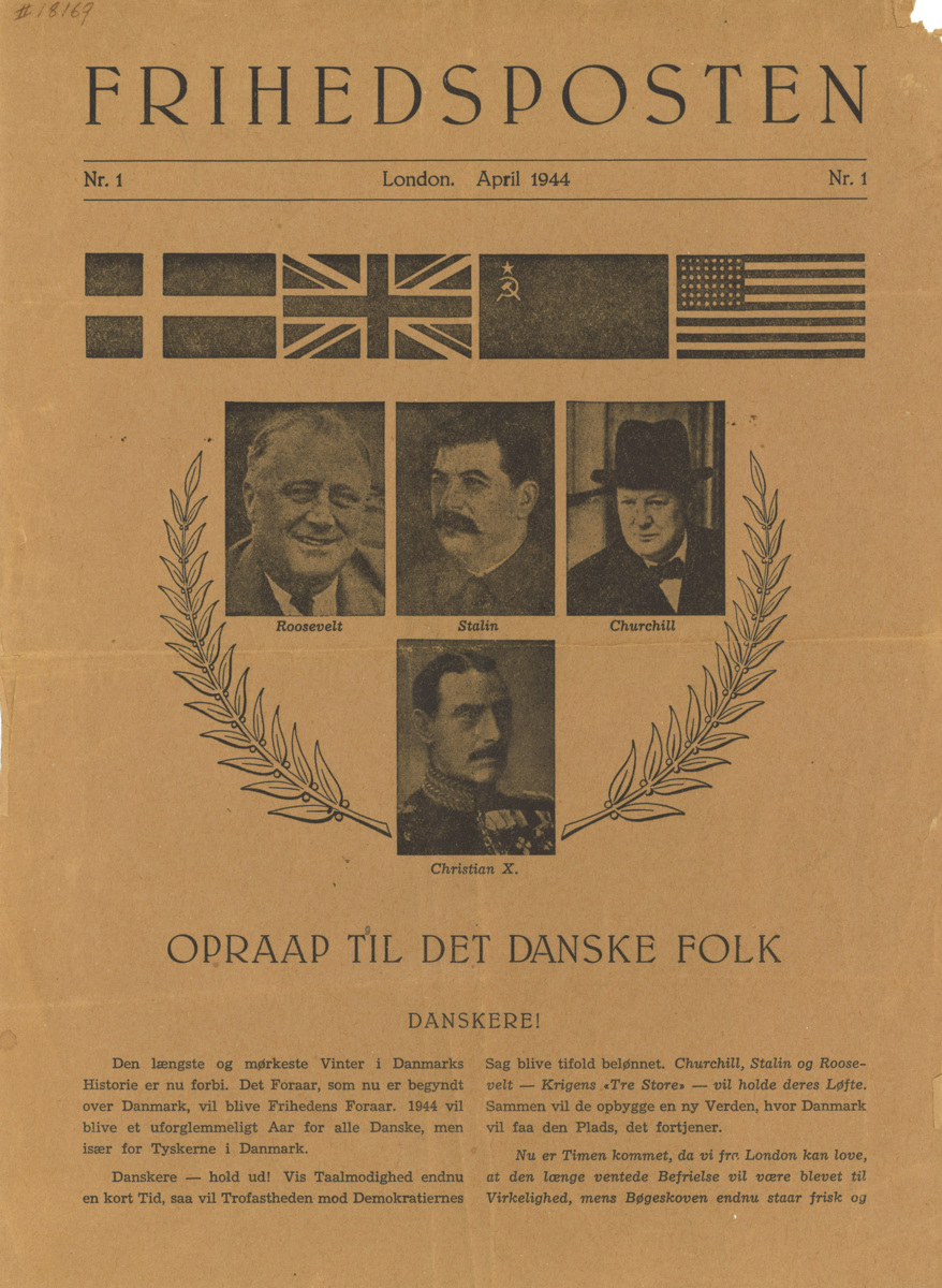 Tvåsidigt flygblad med titeln Frihedsposten från april 1944. Ser ut att vara tryckt i London.