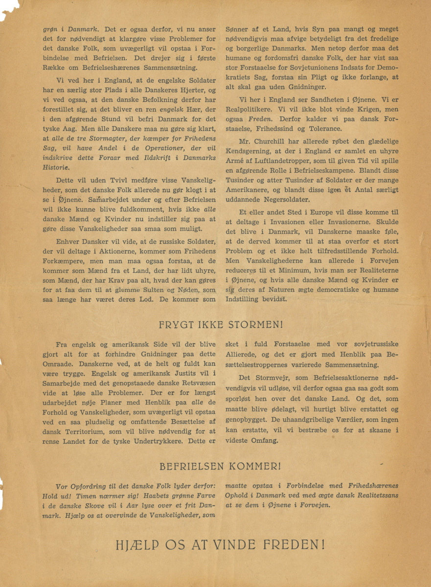 Ett tyskt falsarium: ett flygblad utgivet av tyska krigsmakten och utkastat över Köpenhamn från ett tyskt flygplan en dimmig morgon för att vilseleda danska befolkningen till att tro att det härrörde sig från ett engelsk plan. Falsariet upptäcktes genast av danskarna.