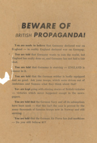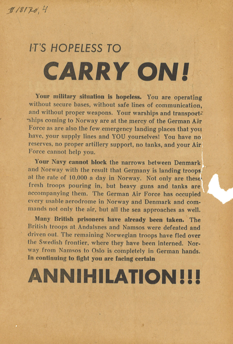 Tvåsidigt flygblad på engelska, skrivet av tyska krigsmakten och avsett för att släppas med flyg över allierade styrkor i Nord-Norge under andra världskriget. Ett av flera tusen som danska motståndsrörelsen omhändertog i maj 1940 på Kastrups flygfält.