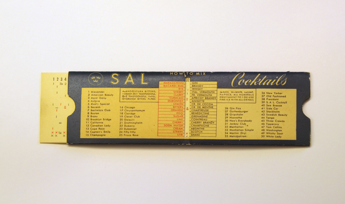 Cocktailmeny med utdragbar sticka, använd ombord på SALs fartyg. På ena sidan står en lista med drinkar och om man drar i stickan kan man utläsa vilka indredienser som ingår i respektive drink. Föremålet har troligtvis använts av passagerare ombord, som haft en sådan meny i hytten för att själva kunna blanda drinkar.