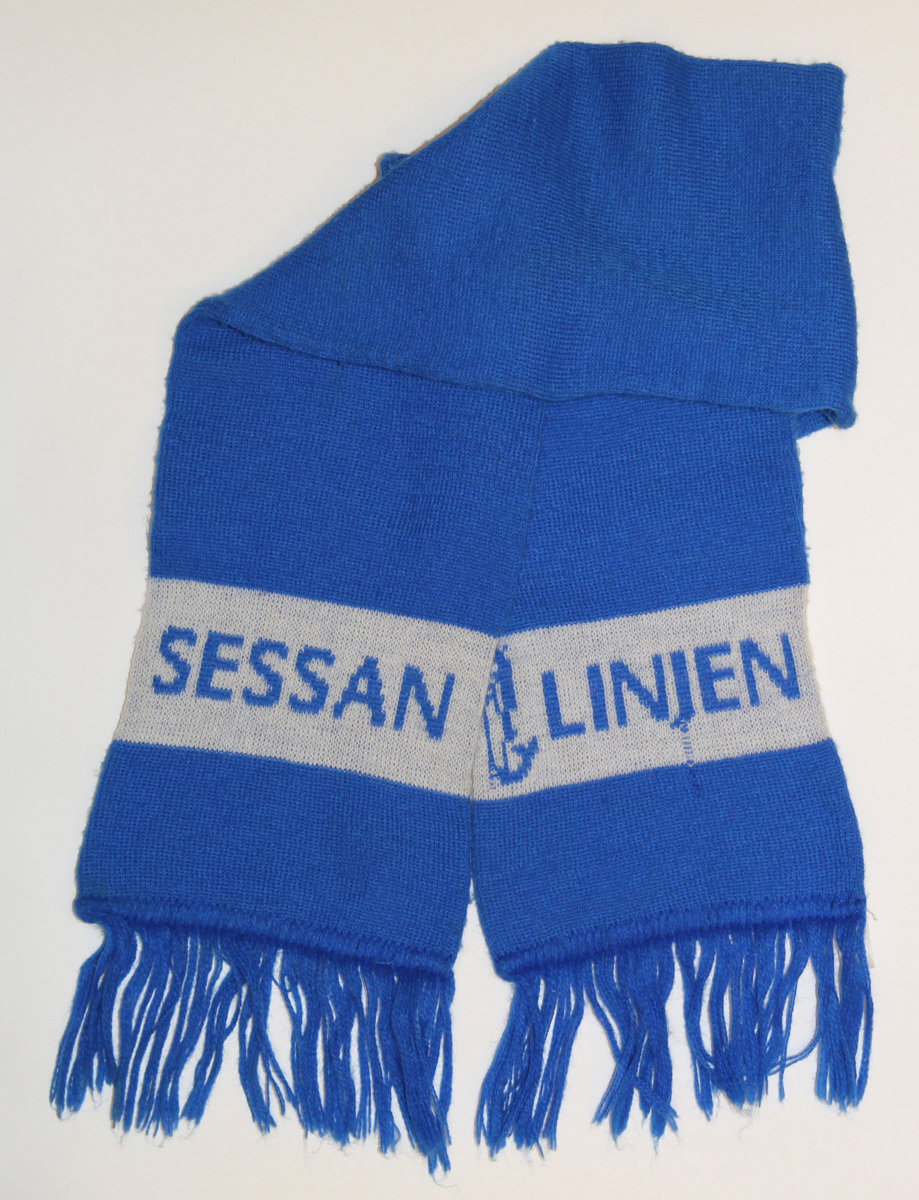 Blåvit halsduk medblå text på vit botten och rederiets logga i ett band längs halsdukens kortsidor.