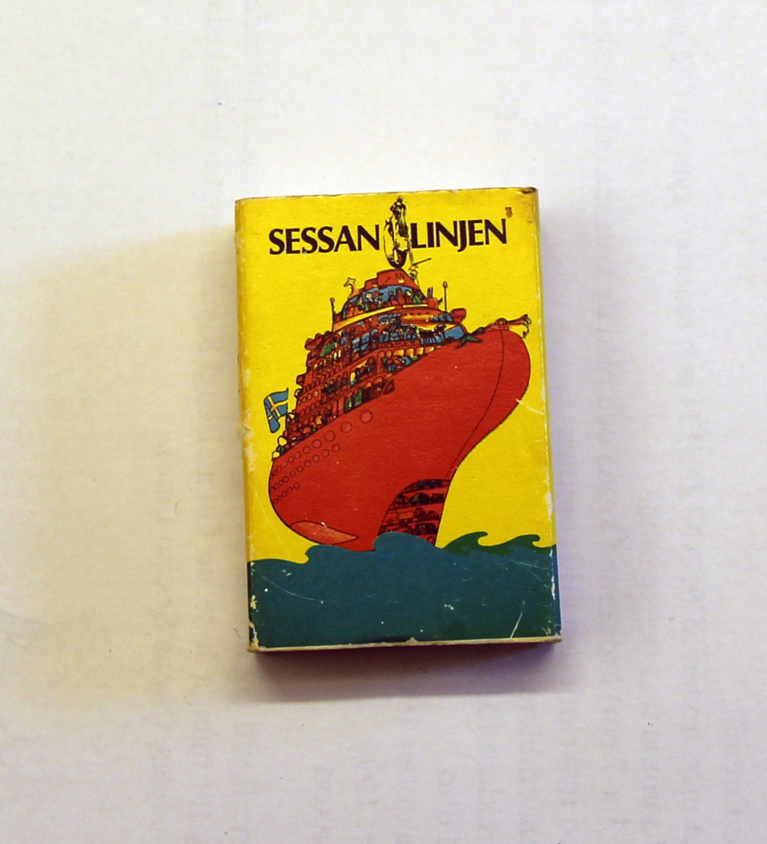Tändsticksask i papper med tryck i gult, grönt rött,svart och blått. Bilden på asken föreställer en fantasibild av Sessanlinjens fartyg.