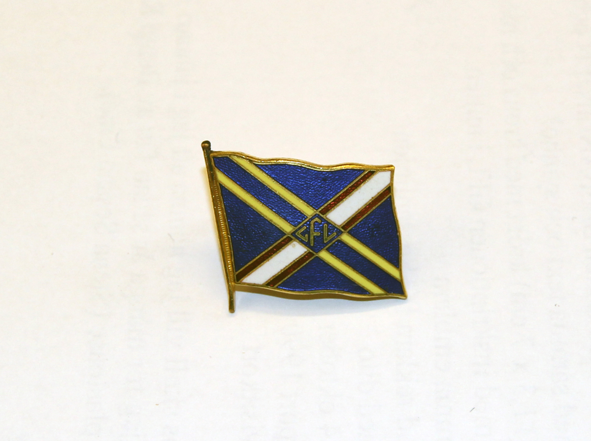 Metalldelen av ett mössmärke föreställande rederiemblemet för GFL. Rederimärket består av ett heltäckande kryss med den ena stapeln i danska och den andra med svenska färger mot en blå bakgrund. I centrum rederiets initialer 'GFL'.