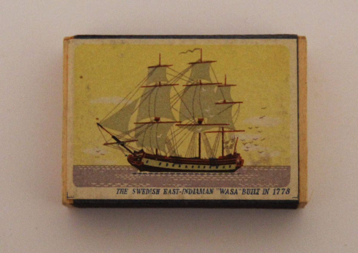 Tändsticksask i trä innehållande ofärgade tändstickor. På ovansidan finns en bild av ett av Svenska Ostasiatiska Kompaniets fartyg och på underisidan en bild på ostindiefararen WASA.