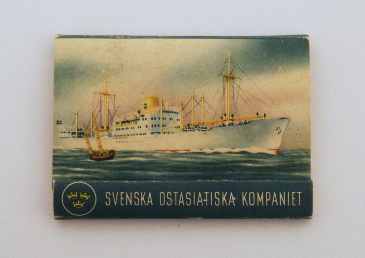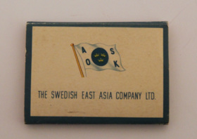Tändsticksplån innehållande mörkblå tändstickor. På ovansidan finns en bild av ett av Svenska Ostasiatiska Kompaniets fartyg och på undersidan rederiets flagga samt logotype.
