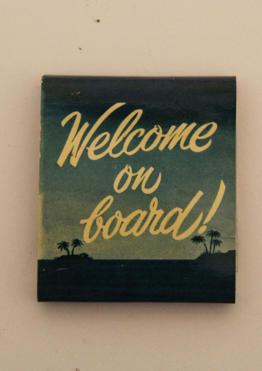 Tändsticksplån innehållande blå tändstickor. På ovansidan finns en bild av Svenska Lloyds fartyg PATRICIA till sjöss och på undersidan syns palmer. Tändsticksplånet har troligvis varit en gåva till gäster som åkt med på PATRICIAs kryssning i Västindien.
