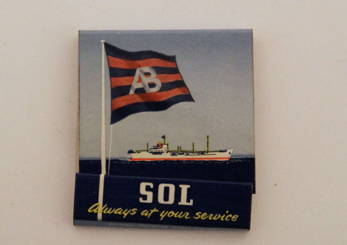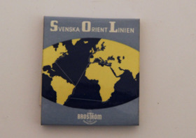 Tändsticksplån innehållande mörkblå tändstickor. På ovansidan finns en bild av ett av Svenska Orient Liniens fartyg samt Broströms rederiflagga och på undersidan finns en världskarta med rederiets linjer utmärkta.