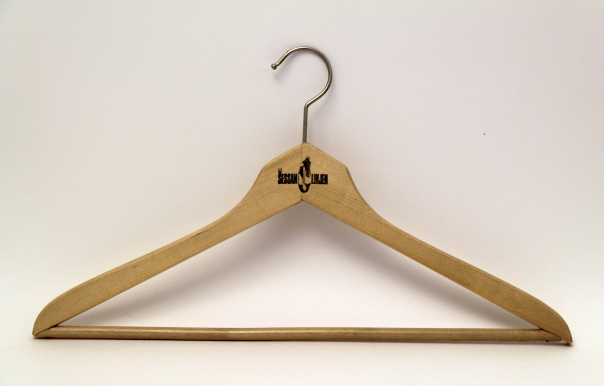 Lackad klädgalge i trä med metallkrok och tryck i svart.